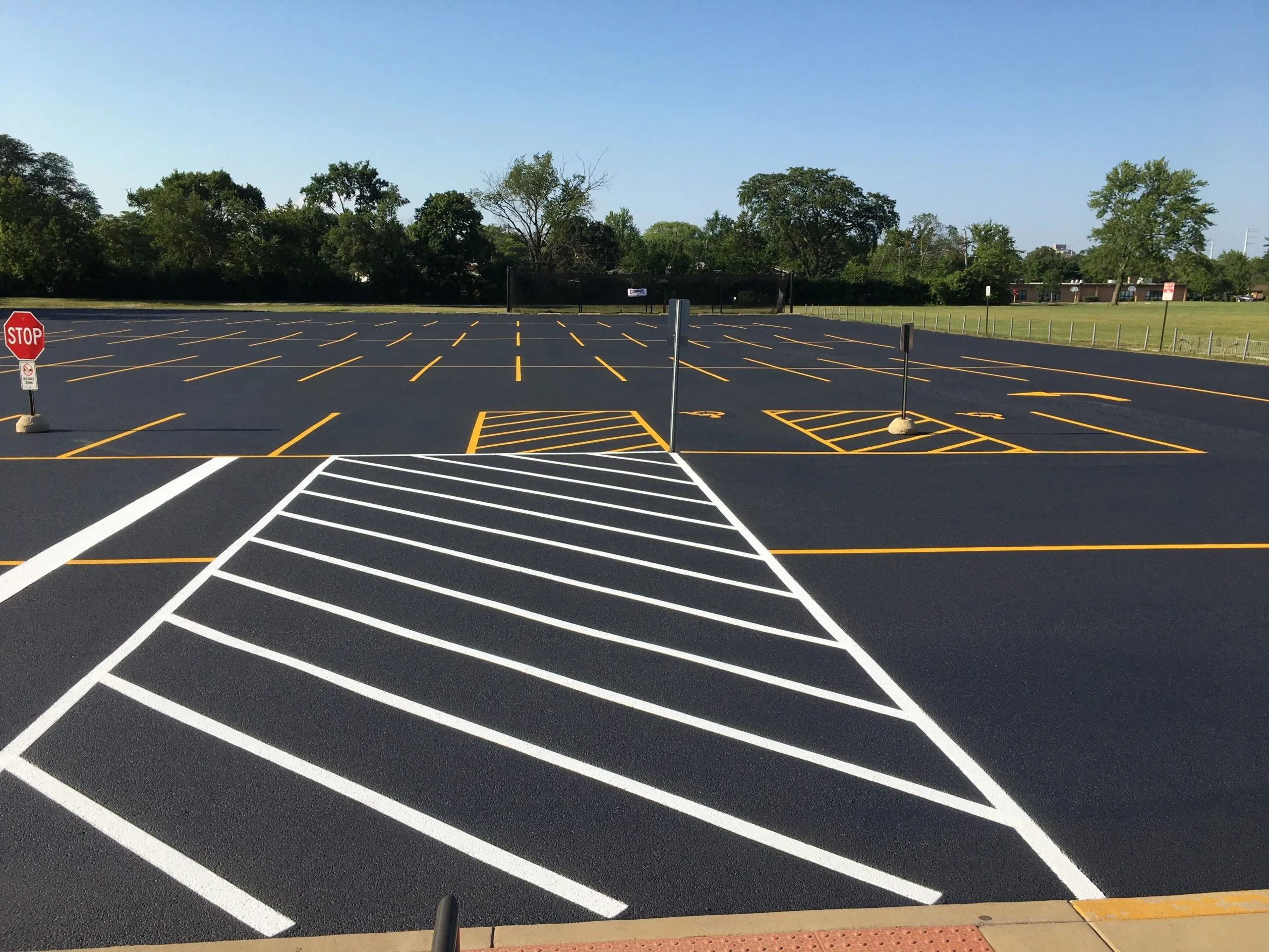 - Enhances contrast with line striping, arrows, ADA spaces, and signage for better visibility.